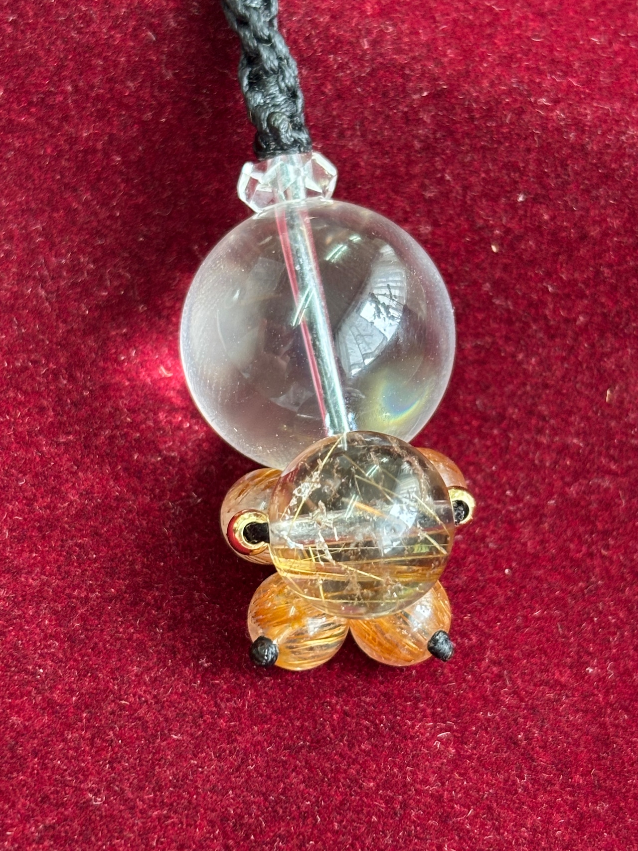 透明度の高い水晶とタイチンルチル、角度で輝き方が変わるキャッツアイルチルを使用♪