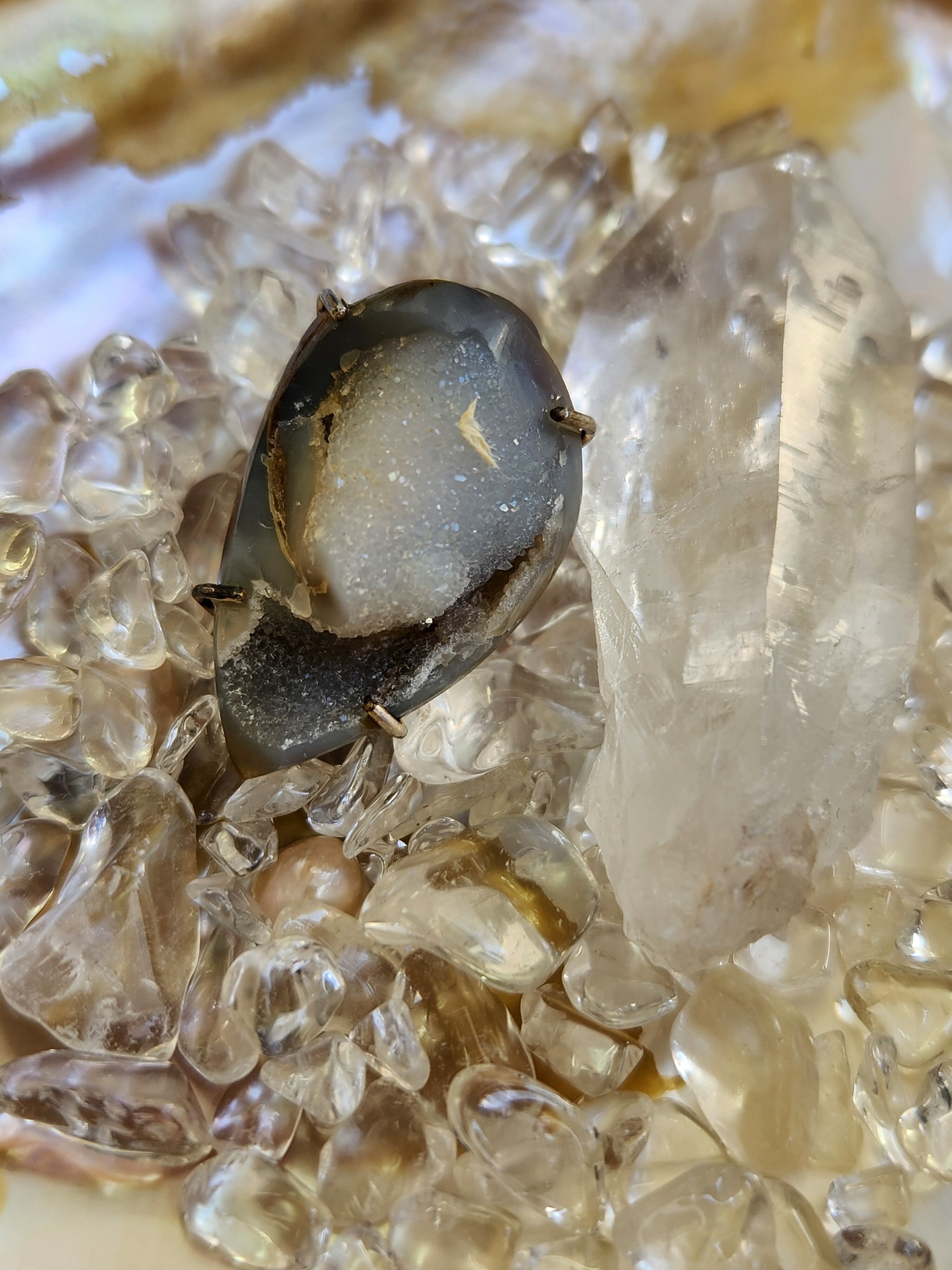 特に、大地のエネルギーを持つアゲートジオードには強いヒーリング効果があるとされ精神的ダメージを癒し心身の安定へと導いてくれると言われます。また子宝のお守りにも良いようです。