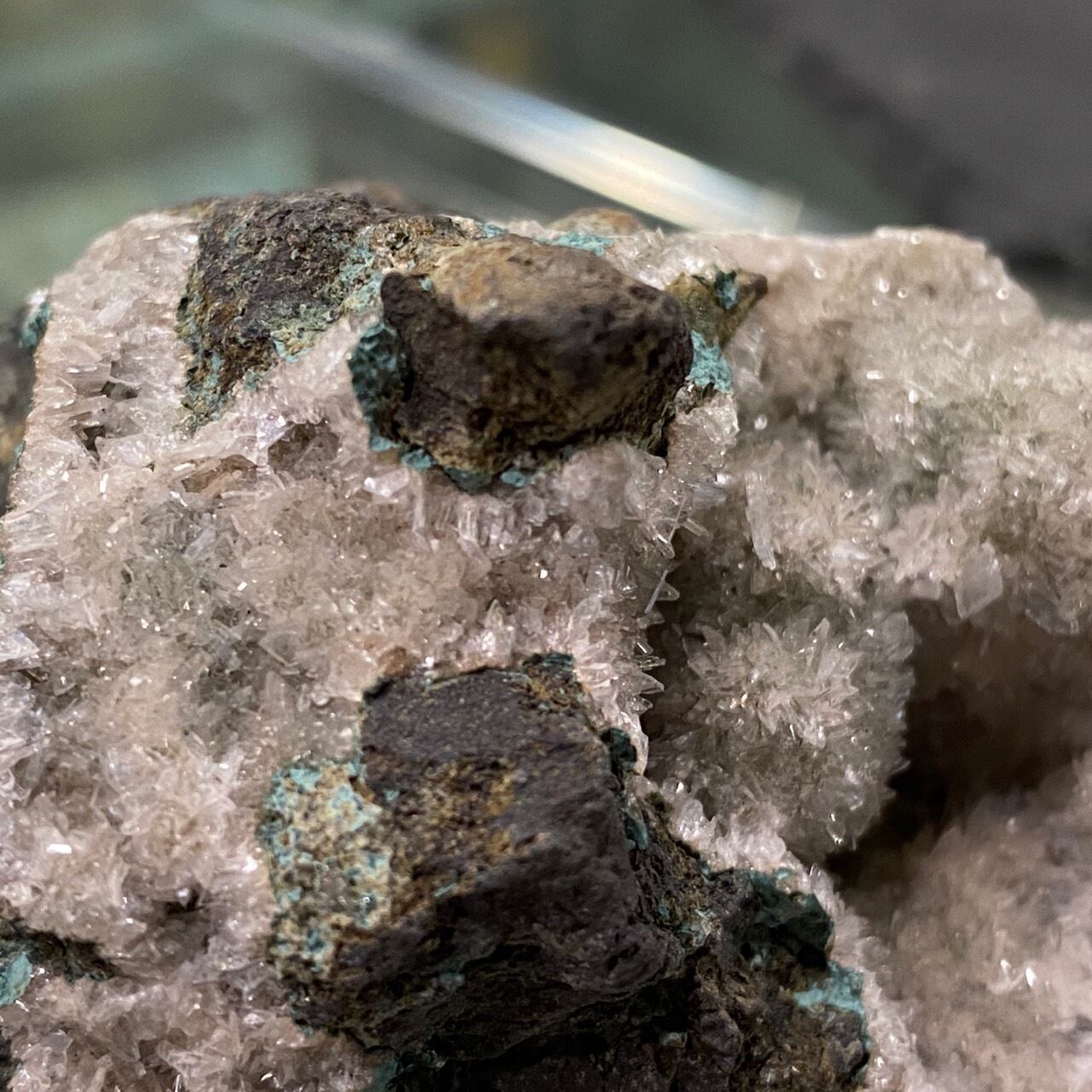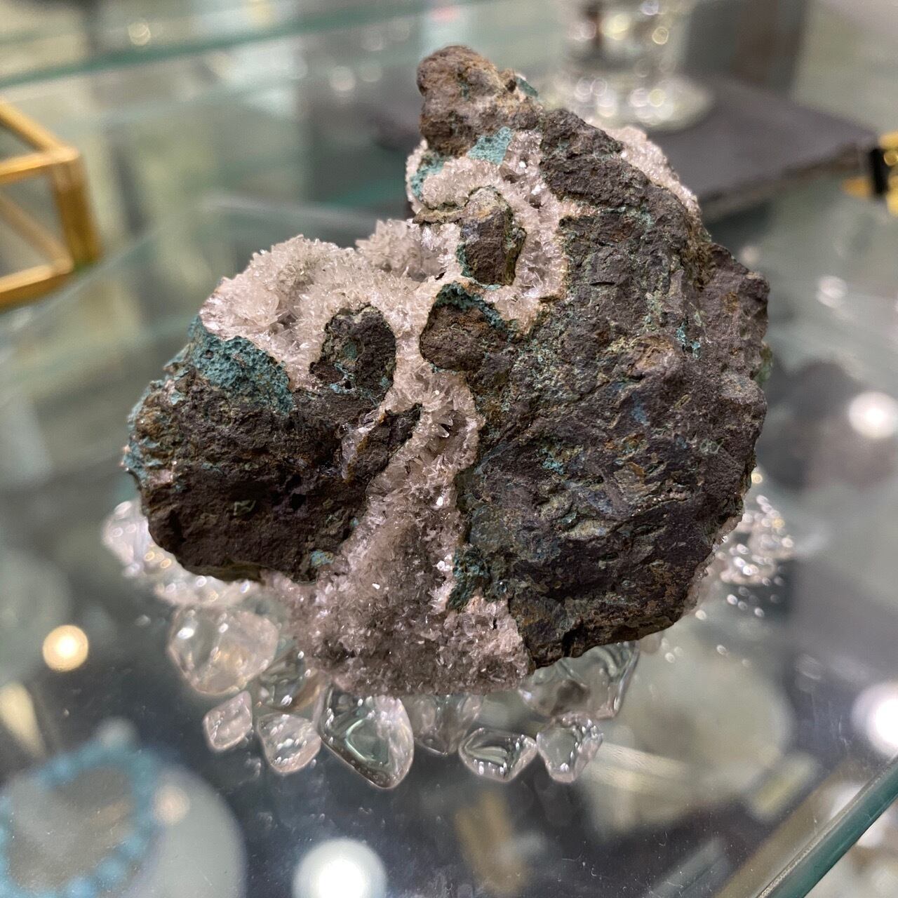 ジオード外側はごつごつとした石ころのようですが、内部は空洞になっており、水晶の小さな結晶がキラキラ輝いてます。
